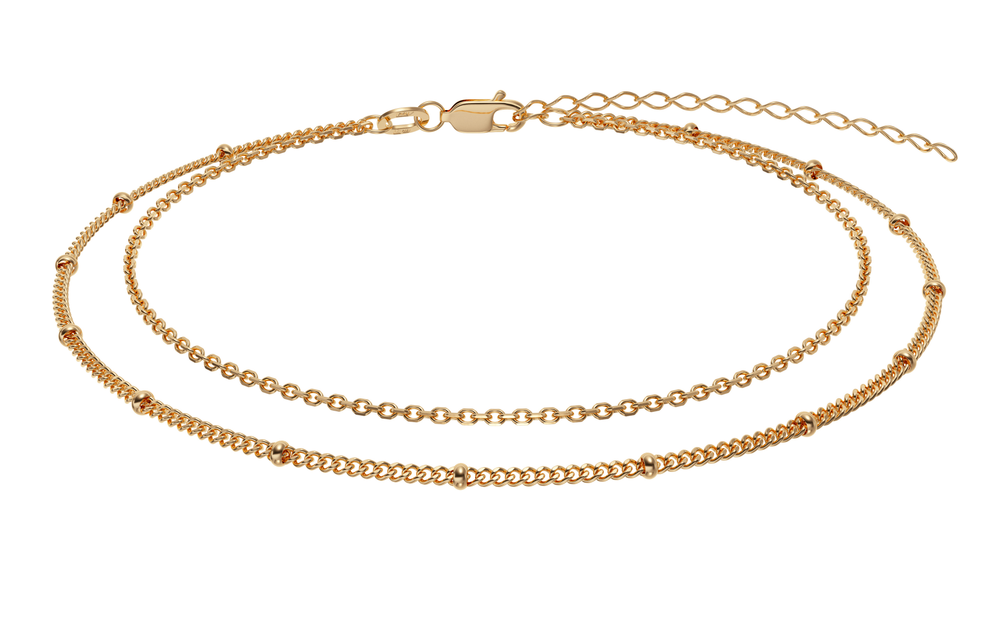 Украшение из коллекция "Анклеты". Браслет из двух цепей: Сатурна 1+1 на Гурмете (d 0,4) и Кобра (d 0,4). Нижняя цепь анклета длиннее. Добор для регулирования длины: Ромб одинарный (d 0,4), 5 см.
