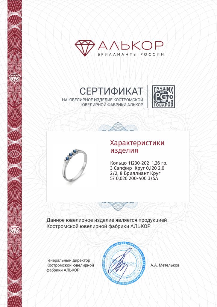 Кольцо из золота 11230-202. Вставка: 8 Бриллиант Кр 57 0.026 ct 3/5А; 3 Сапфир 0.12 2.0 2/2