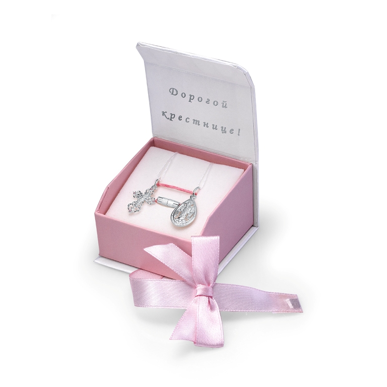 В комплект входят праздничная упаковка, крестик из серебра 925 пробы, подвеска Ангел-Хранитель из серебра 925 пробы и гайтан с замком из медицинского сплава. Гайтан можно регулировать по размеру.