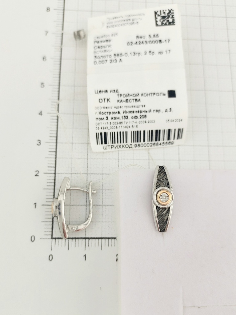 Серьги из серебра 02-4243/000Б-17. Вставка: 1 Золото 585 0.650 . 2 Бриллиант Круг 17 0.007 200 400 2/3А