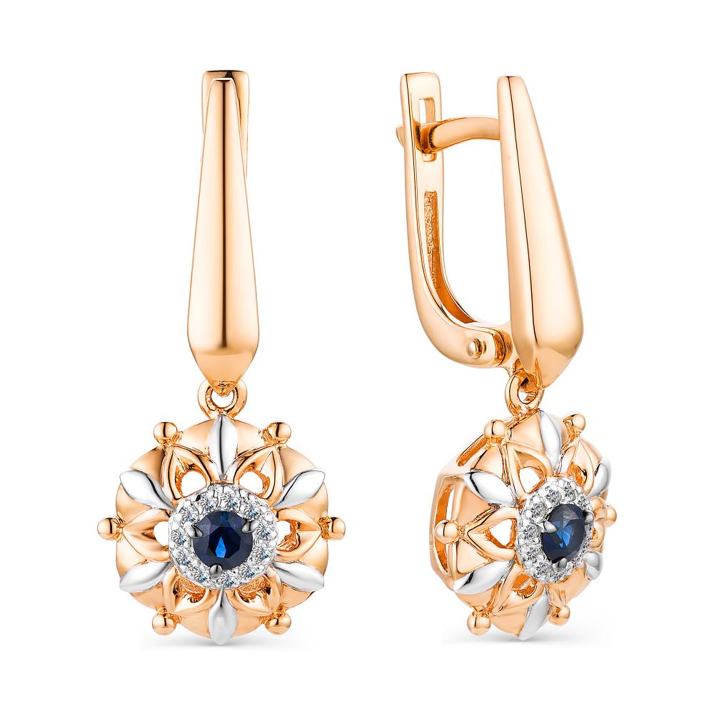 Серьги из золота 23158-102. Вставка: 2 Сапфир 3.0 0.295 2/2; 22 Бриллиант Кр 17 0.080 ct 2/3А