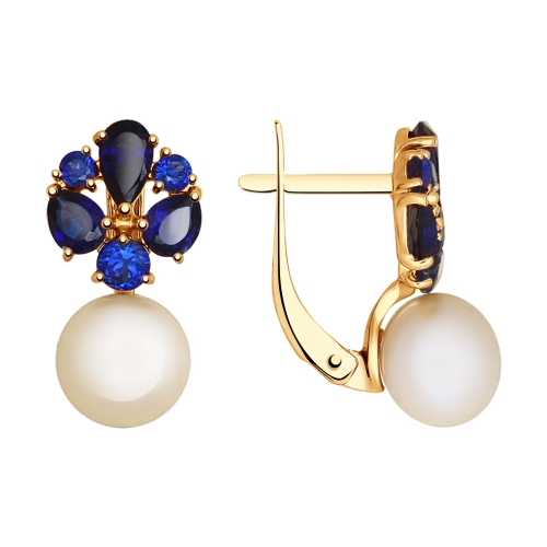 Серьги из золота 792033. Вставка: 2 Жемчуг синт. преснов. Круг Кабошон 7 ; 4 Корунд синт.недраг груша 4*3 ; 4 Корунд синт.недраг Круг 2 ; 2 Корунд синт.недраг Круг 3 ; 2 Корунд синт.недраг груша 5*3