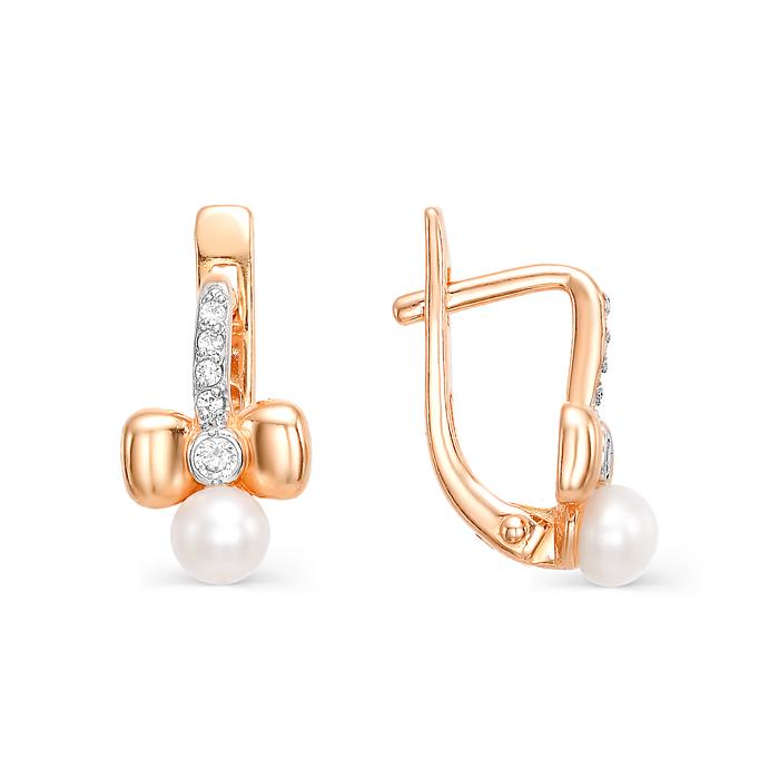 Серьги из золота С142-575. Вставка: 8 Фианит круг 1.0 б/ц 0.014, 2 Жемчуг синт. культ. круг 4.0 0.210, 2 Фианит круг 1.75 б/ц 0.017